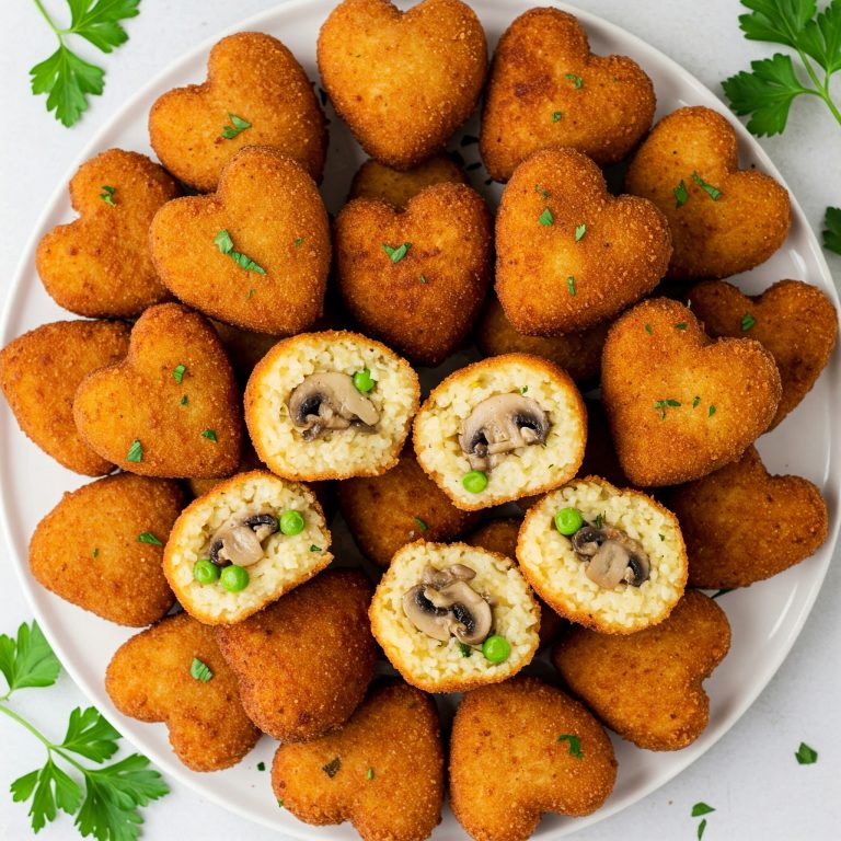 These heart-shaped Sicilian rice balls with mushrooms and peas offer a delightful and unexpected twist on a classic Italian favorite, making them the perfect romantic treat for Valentine’s Day. They’re not only visually appealing but also packed with savory flavors and satisfying textures.